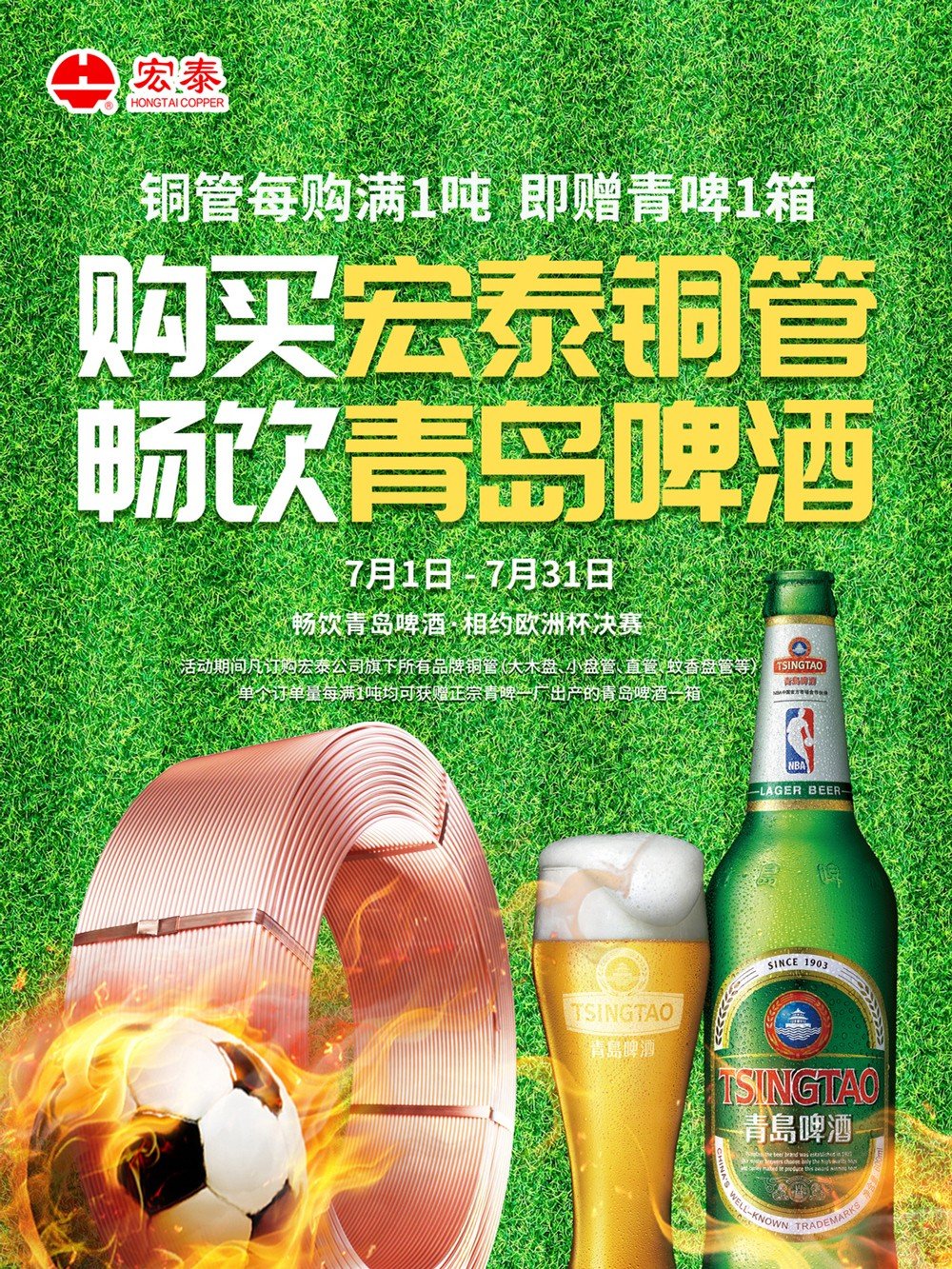 7月1日至7月31日期間,凡訂購宏泰公司旗下所有品牌銅管(大木盤、小盤管、直管、蚊香盤管等)的客戶,單個訂單量每滿1噸,即可獲贈青啤一廠生產的青島啤酒一箱
