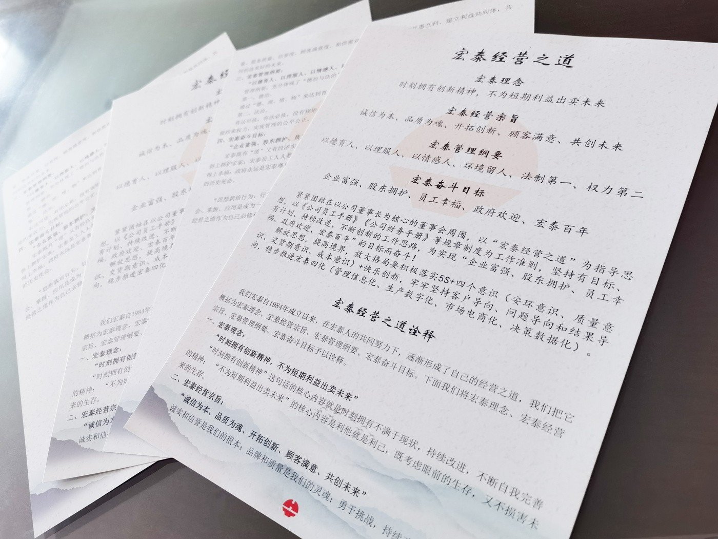 奮進的道路上,李福鵬一直秉承“宏泰經營之道”的指導思想。堅持“時刻擁有創新精神,不為短期利益出賣未來”的宏泰理念,本著利己不損人,堅持利他才能利己,合作才能雙贏的管理思維,積極落實5S + 四個意識 + 快樂創新;牢牢堅持客戶導向、問題導向和結果導向;重點聚焦法制第一和精細化思維工作方式,圍繞宏泰經營宗旨和管理綱要的中心思想,逐漸使宏泰人形成人心思進、團結和諧、共促發展的良好氛圍,在穩步推進宏泰四化的基礎上,堅持穩走四條道路:堅持宏泰經營之道厚德載物,走員工幸福的道路;堅持把合規放首位,走穩健經營的道路;堅持管理信息化和生產數字化直至智能化的兩化深度融合,走分工專業化道路;堅持KPI考核,走績效管理的道路。