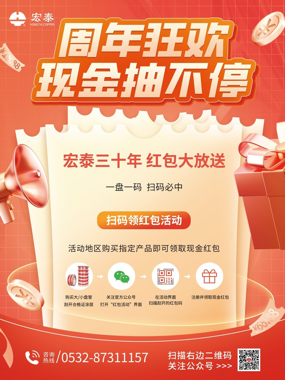 2023年,宏泰30歲。在這具有重大意義的時刻,公司經過前期的技術研發,決定在宏泰30年來臨之際,推出感恩客戶的又一具體活動——掃碼領紅包。凡是宏泰銅管的終端用戶,購買宏泰銅管后,通過手機掃碼,均可領取金額不等的紅包。公司通過這一活動,力促進一步粘合與客戶緊密度,真正做到回饋終端客戶。通過掃碼領紅包活動,讓客戶真切感受到公司在回饋客戶方面的熱情。為了真正做到回饋終端客戶,參與該活動的,僅限宏泰銅管的終端客戶,經銷商不參與該活動。讓利終端客戶(非中間商),這在宏泰歷史上是首次,是一次全新的嘗試,公司后期會推出更多的感恩客戶的具體活動,敬請期待。