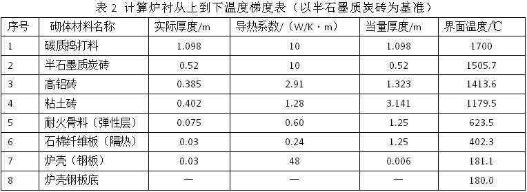 30MVA矮煙罩礦熱爐采用整體保溫爐襯砌筑技術(shù),其筑爐主要用料如下表1,計算爐襯從上到下溫度梯度如表2所示
