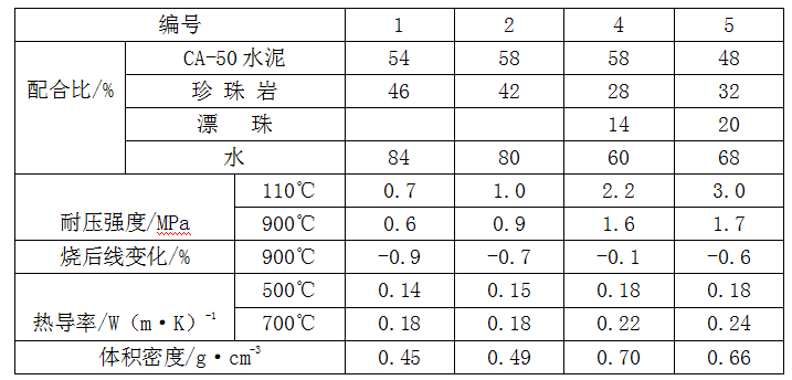 珍珠巖耐火澆注料的一般使用溫度為600~900℃。因此,采用硅酸鹽水泥作結(jié)合劑,完全能滿足窯爐的使用要求。硅酸鹽水泥珍珠巖耐火澆注料的配合比;425號(hào)普通水泥40%、黏土粉16%、膨脹珍珠巖44%和水98%;其主要性能為體積密度0.48g/cm3,耐壓強(qiáng)度1.0MPa和600℃的熱導(dǎo)率0.16W(m·K)。