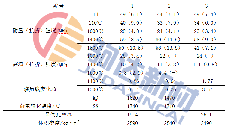 電熔鋁酸鹽水泥耐火澆注料配制時(shí),水泥用量為18%,耐火粉料采用電熔剛玉粉,耐火骨料最大粒徑為5mm,其顆粒級(jí)配(%)為:5~3mm,30~40;3~1m;25~30mm;<1mm,35~45。同時(shí)用緩凝劑和減水劑等復(fù)合外加劑。該澆注料成型初凝后,因水化熱在8h內(nèi)放出較多,故應(yīng)在潮濕環(huán)境中自然養(yǎng)護(hù),或進(jìn)行標(biāo)養(yǎng),但不宜放進(jìn)水中養(yǎng)護(hù)。養(yǎng)護(hù)到期后,檢驗(yàn)常溫強(qiáng)度。烘干后,檢驗(yàn)各種高溫性能,詳見表1-1。表中編號(hào)1、編號(hào)2和編號(hào)3,分別用電熔剛玉、燒結(jié)剛玉和一級(jí)礬土熟料作耐火骨料,其水用量分別為9%,8.7%和12%。從表中看出,1天常溫耐壓強(qiáng)度達(dá)到43~50MPa,顯示了快硬旱強(qiáng)的特點(diǎn),其強(qiáng)度已占總強(qiáng)度的80%左右。