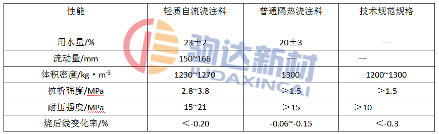 試樣經815℃熱處理后,進行物理性能的測試,并用普通隔熱澆注料作對比試驗,其結果列于表2。