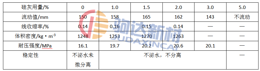 (2)硅灰既對澆注料的流動性和物理力學性能有貢獻,又具有粘稠性,與自制超細粉的復合使用,可同時獲得對流動性和穩定性的需要,硅灰的適宜用量為1.5%〜2.0%。