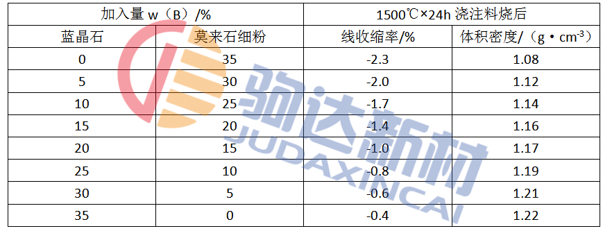 表3 藍晶石加入量及其對莫來石耐火澆注料性能的影響