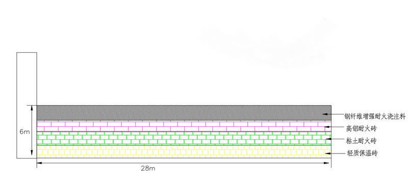 在對臺車面所砌筑的耐火磚進行改進的同時需要考慮的首要問題就是所使用耐火材料的耐火性能即材料的荷重軟化溫度要高于正常加熱爐使用溫度的100~150℃,然后其考慮材料的耐磨性能和整體性能,在受到大型鑄件放上去以后臺車在推進的同時所產生的重力對耐火材料不能產生破壞的應力。只有保持完整的整體性和耐磨性才能保證對鑄件上脫落下來的氧化鐵皮的抗侵蝕性能。我公司在經過一系列研究后選用了鋼纖維增強澆注料對臺面的耐火材料進行一次性澆注的方案。鋼纖維增強澆注料采用的剛玉級別的耐火骨料其致密度要大于之前所使用的耐火磚,為了防止使用剛玉為骨料配制的耐火澆注料高溫下容易發生的脆性,,在其里面添加相當量的鋼纖維作為曾韌的效果。以下是我公司鄭州駒達新材料科技有限公司所設計的新型臺車面第一層為輕質保溫磚砌筑、第二層為粘土耐火磚、第三層為高鋁耐火磚,最后用鋼纖維增強澆注料一次完成整體澆筑,促使臺車面整體結構一致的效果。