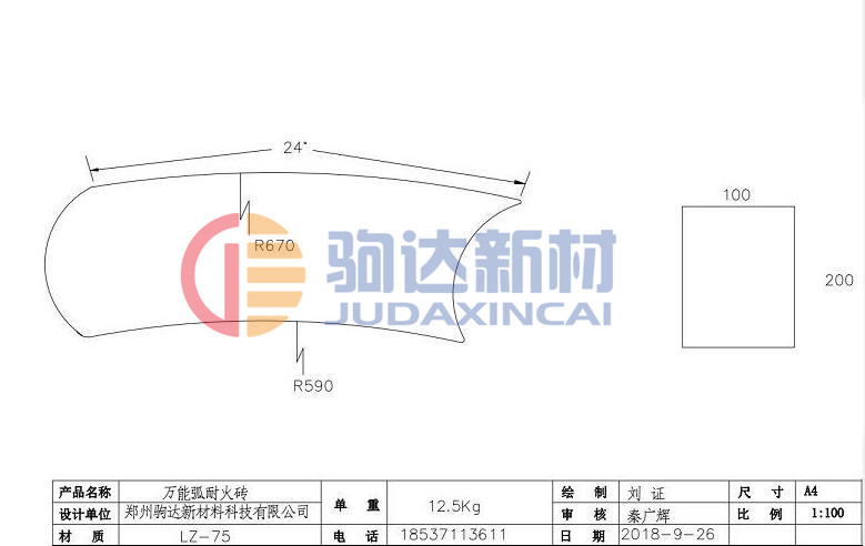 我公司根據相關資料設計內襯耐火材料使用的磚型為萬能弧耐火磚,改雙層壁厚為單層壁厚,萬能弧耐火磚型尺寸定為280X200X100(mm),下圖(1)為我公司設計圖紙,砌筑方法為:外層緊貼爐殼為輕質保溫澆注料體積密度為1.3g/cm³,內層為萬能弧耐火磚,單層砌筑每圈需要數量為39塊,下圖為設計方案(2)。