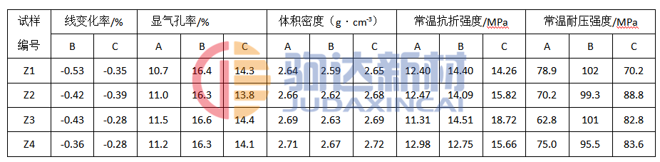 按照相關國家標準分別檢測試樣的線變化率、顯氣孔率、體積密度、常溫抗折強度和常溫耐壓強度。