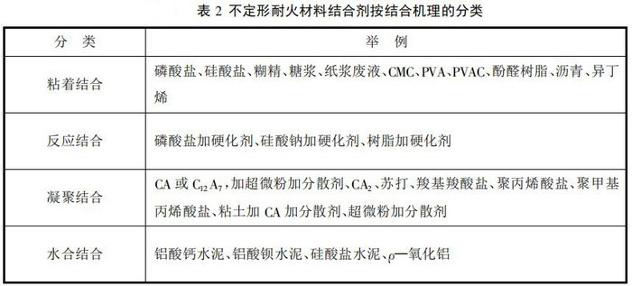 按照分類方法,不定形耐火澆注料的結合劑又可分為凝聚結合,反應結合,水合結合和粘著結合等四大類(表2)。衡量結合劑結合性能的主要性質是制品的強度,即各個溫度處理后的抗折強度和抗壓強度。其它如施工性能等也是很重要的。