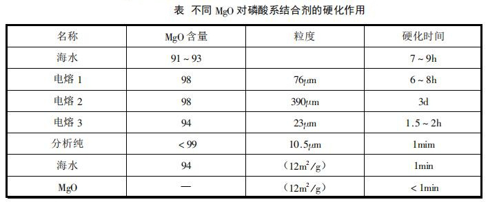 因MgO與磷酸反應迅速,必須嚴格控制其用量,以便獲得適宜的凝結硬化速度,滿足施工的需要。下表示出了不同MgO對磷酸耐火澆注料的促凝作用。