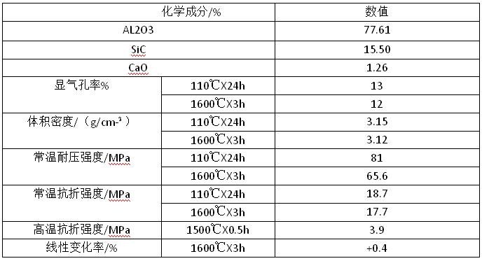 上表中的各項理化性能,除1600℃保溫3h燒后耐壓強度略低外其它各項指標都很優秀1 600℃保溫3h燒后耐壓強度指標比較低的原因為本澆注料中SiC含量較高,煅燒溫度又很高,故SiC在煅燒中的氧化難以避免,從而影響了強度,而且煅燒后由于氧化表面凸凹不平也使檢測時的耐壓強度下降如果將其埋炭煅燒,則強度可達到107.5MPa。