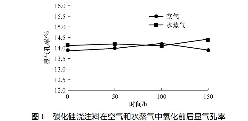 圖1示出了碳化硅澆注料在空氣和水蒸氣氧化前后的顯氣孔率。可以看出,無論是空氣還是水蒸氣氧化,顯氣孔率均變化不大。氧化150h試樣與氧化前相比,水蒸氣條件下的顯氣孔率略有增大;空氣條件下的顯氣孔率略有減小。可能與水蒸氣條件下試樣結構遭到較大破壞有關。一般情況下,碳化硅氧化會因氧化產物SiO2等堵塞氣孔導致氣孔率在氧化初期下降明顯,后期逐漸趨于平穩,但對于碳化硅澆注料卻沒有出現早期顯氣孔率下降的情況。可能