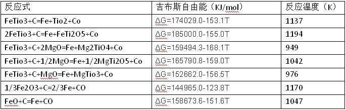 鈦渣是一種高熔點的爐渣。鈦渣熔體具有強(qiáng)腐蝕性、高導(dǎo)電性和黏度變化劇烈的特點。鈦渣 的主要成分是TiO,此外還含有相當(dāng)數(shù)量的低價鈦氧化物(Ti3O5、Ti2O3、TiO)和鐵氧化物(FeO和Fe2O3),因而具有極高的化學(xué)活性。鈦渣電爐的爐內(nèi)最高溫度可達(dá)2073K,在這樣高的溫度下,它們幾乎能與所有的金屬和非金屬材料發(fā)生化學(xué)反應(yīng)。事實上,工業(yè)生產(chǎn)時作為工作層的爐襯無論采用哪一種耐火材料,都會被鈦渣熔體所腐蝕,嚴(yán)重時甚至出現(xiàn)爐墻穿孔等生產(chǎn)事故。以常見的鎂質(zhì)或碳質(zhì)耐火材料為爐襯時,熔煉鈦渣時熔池內(nèi)的熔液與爐襯耐火材料發(fā)生的主要化學(xué)反應(yīng)和標(biāo)準(zhǔn)吉布斯自由能方程式見表1所示。